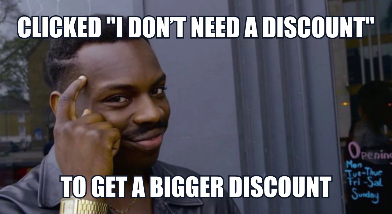 Well played! By saying ‘no thanks’ to a discount, you've unlocked a hidden 32% off. Enjoy this secret deal and don’t let it slip away!